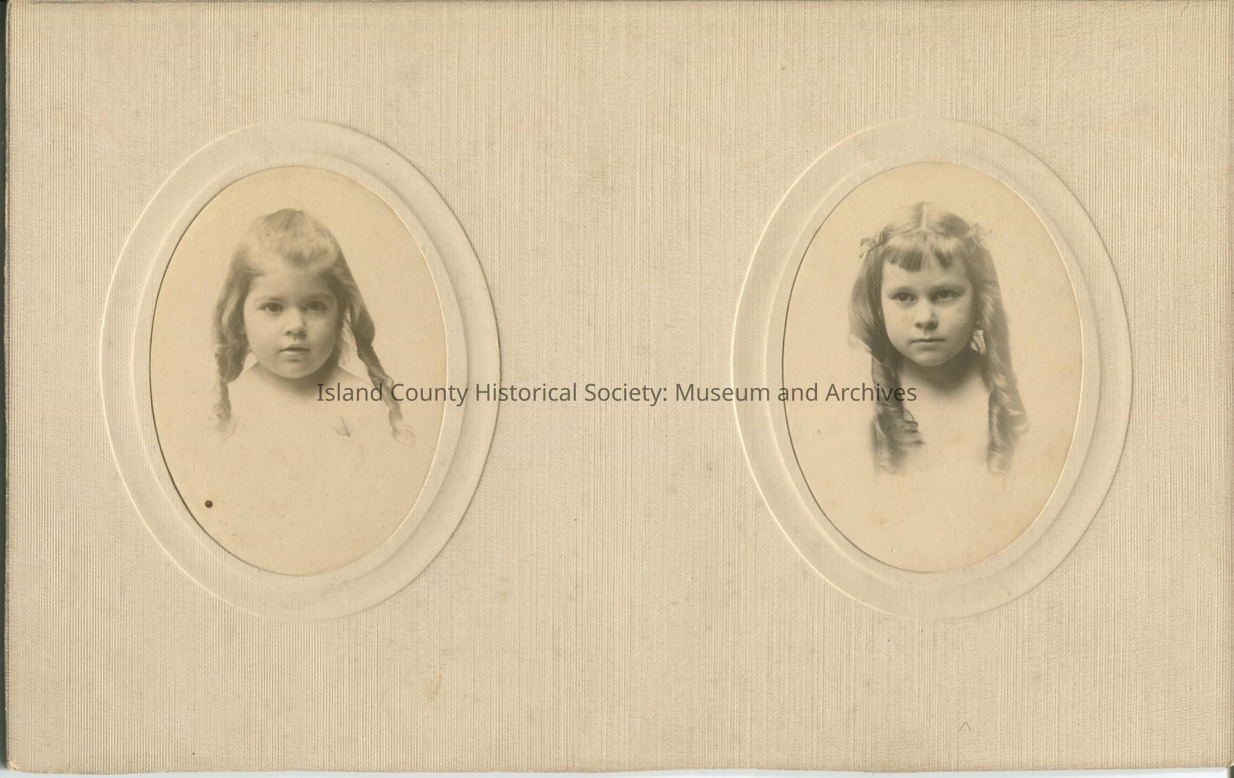 Black & white portrait of the faces of two small girls. Both girls have ringlets in their hair.The description on the back says, "Hester". The photos of the two girls are cut in ovals and mounted on card stock.
