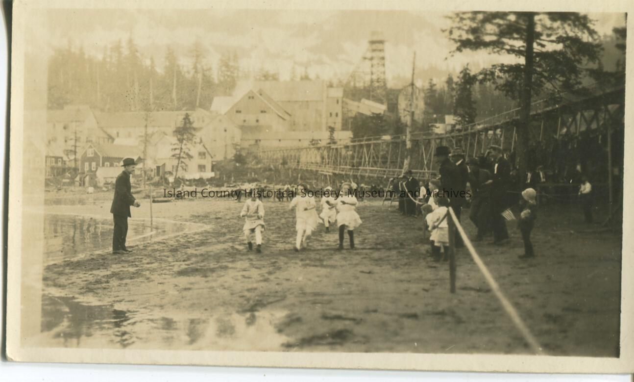 Black & white photo of group of girls in a running contest. Bystanders are standing behind a rope barrier observing the race. The photo taken in a town on the shore of a lake/salt water. The town looks like a lumber town. No description or date. However, based on the postcard stamp, AZO with triangles in the corners, the photo was taken between 1904-1918.Made/Created