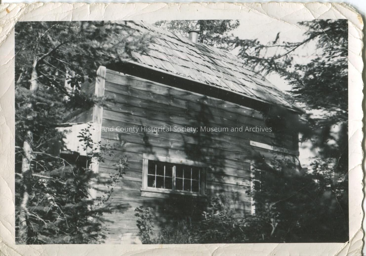 Black & white photo of a wood-sided cabin. No description or date.