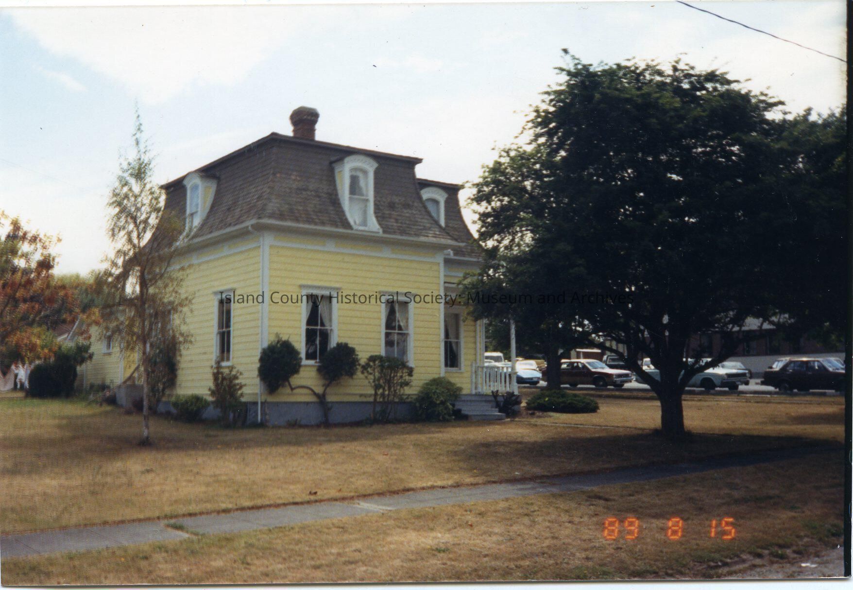 Photo of a house with a central chimney, tall windows on ground floor, 3 windows on the mansard-style roof, narrow front porch, bushes and trees. Sidewalk in front. This house is located at 101 NE 7th St. Coupeville. The courthouse is in the background.
