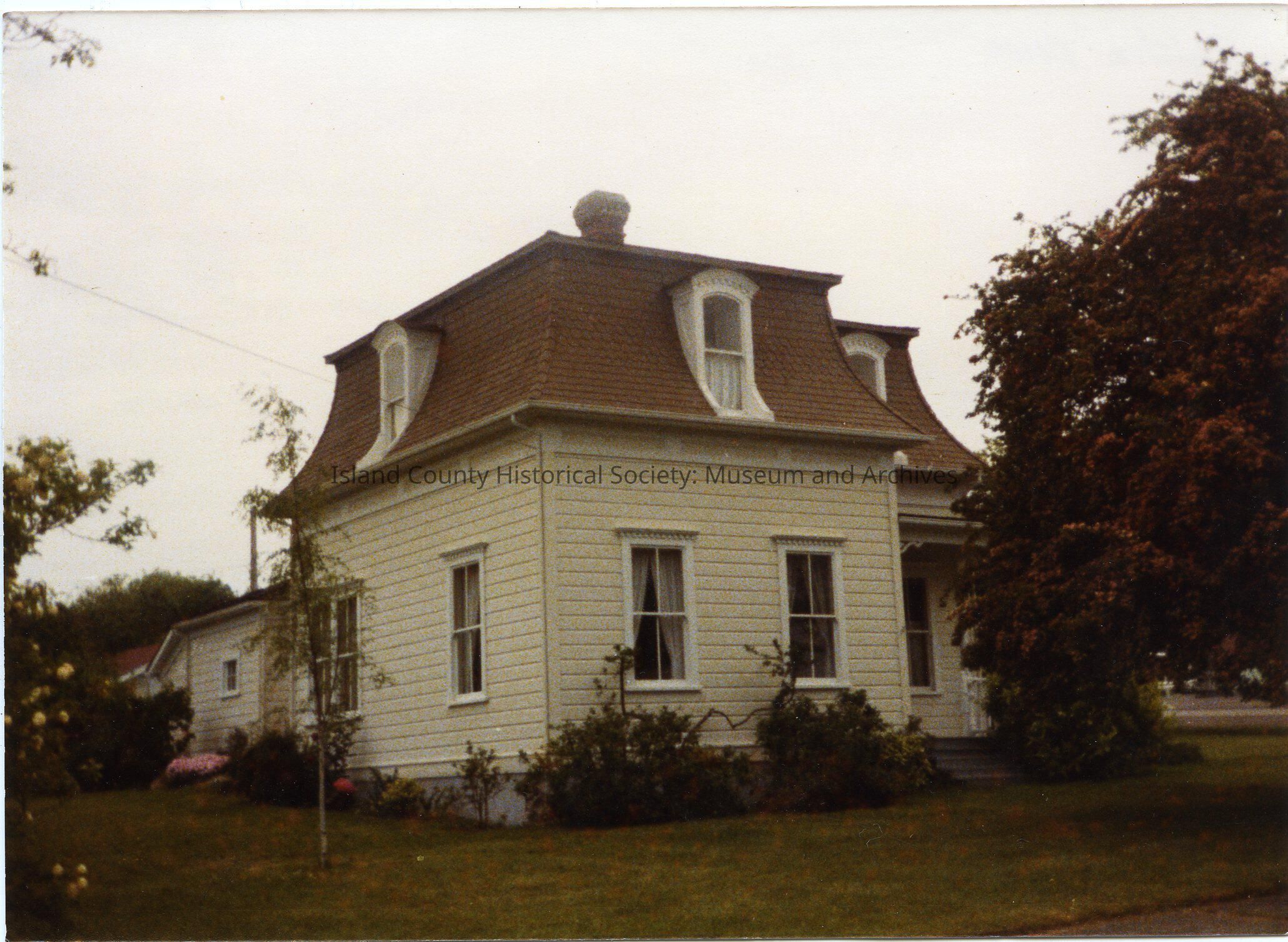 Photo of a house with a central chimney, tall windows on ground floor, 3 windows on the mansard-style roof, narrow front porch, bushes and trees.Sidewalk just visible in front. This house is located at 101 NE 7th St. Coupeville. The courthouse is in the background.
