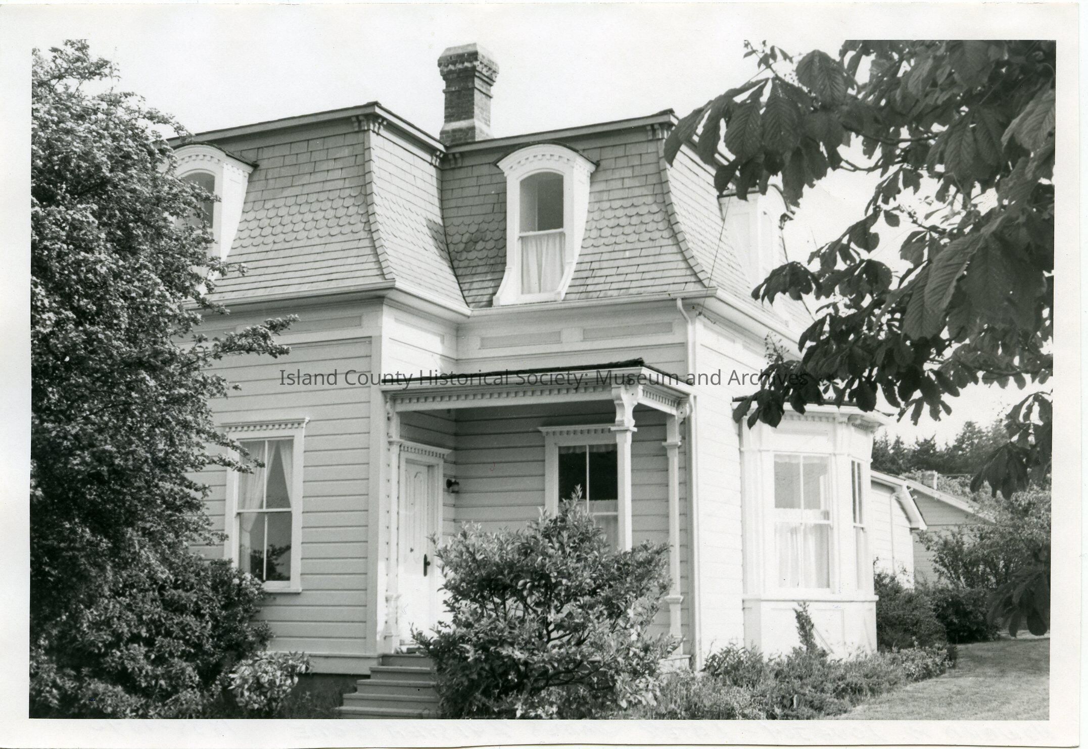 Photo of a house with a central chimney, bay window on the right of the photo, 2 windows on ground floor, 3 windows on the mansard-style roof, narrow front porch, bushes and trees. This house is located at 101 NE 7th St. Coupeville.