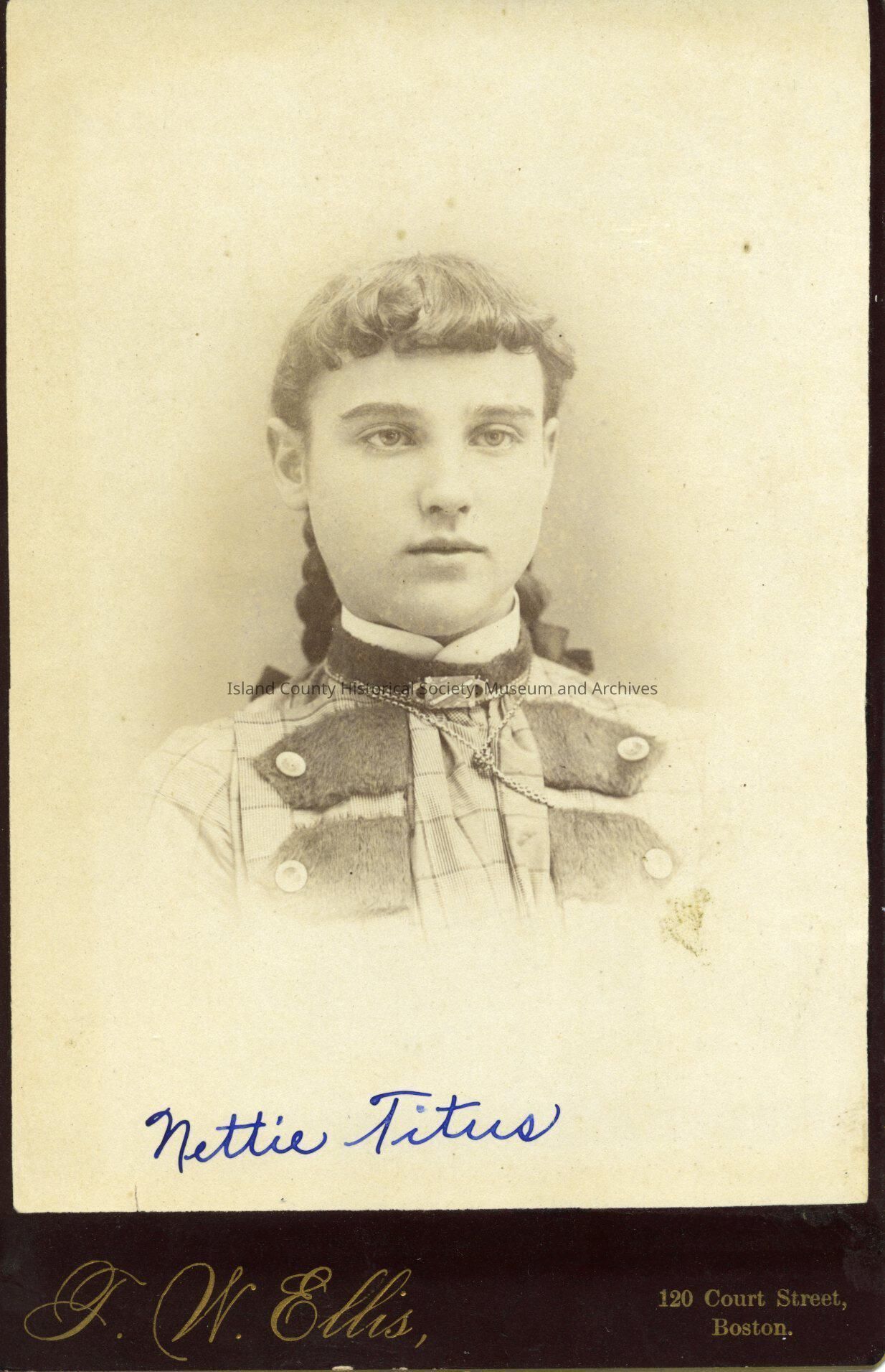 Portrait of Nettie Titus wearing a military inspired style dress with small chains around the neck.