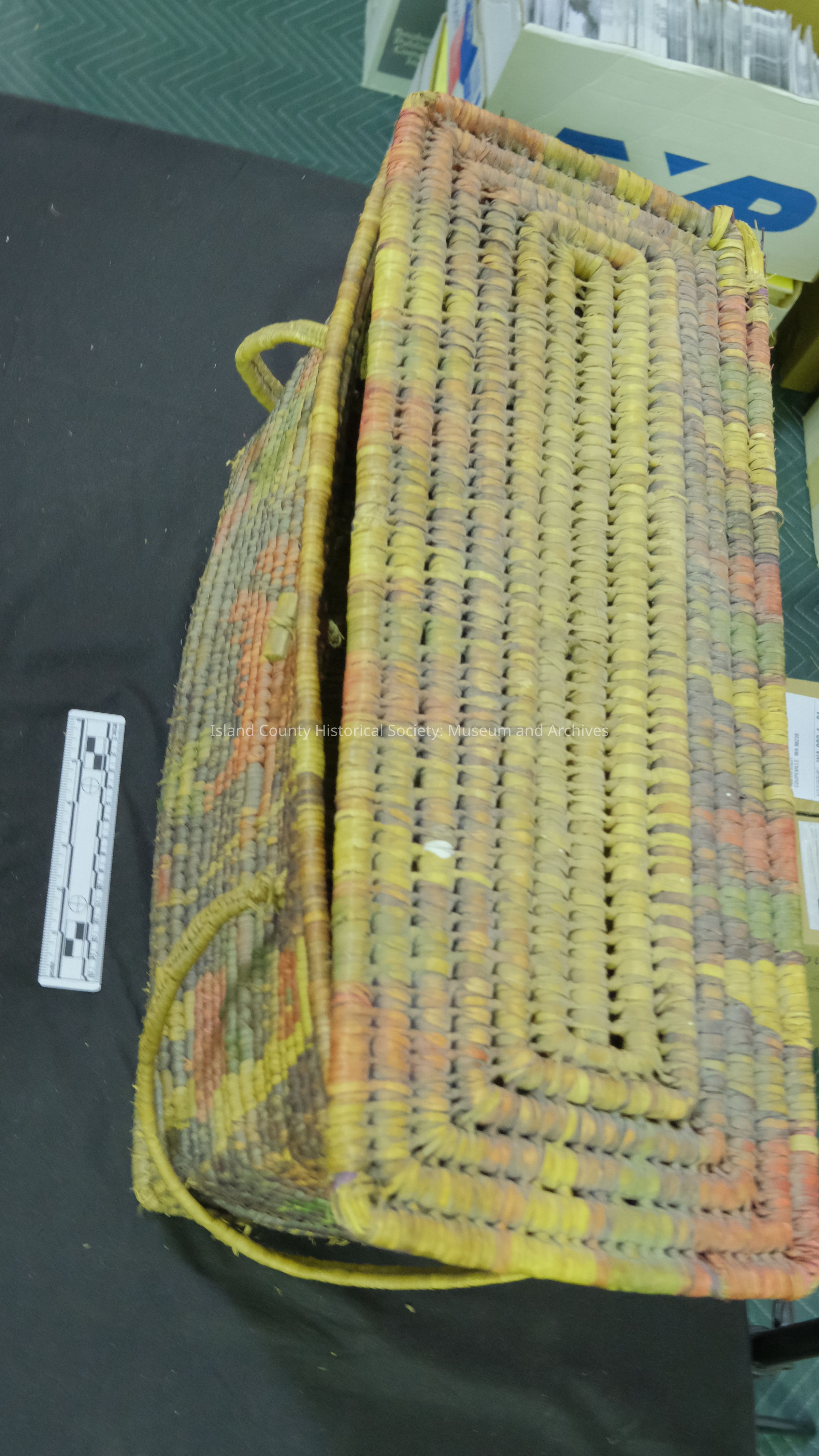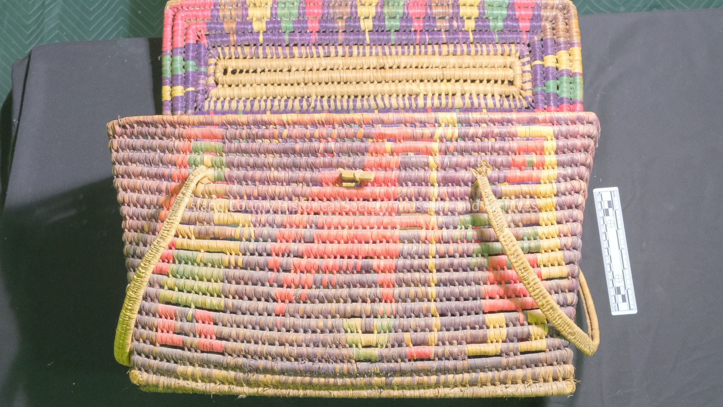 Indigenous made basket - coiled cattails, green purple bands, slightly faded