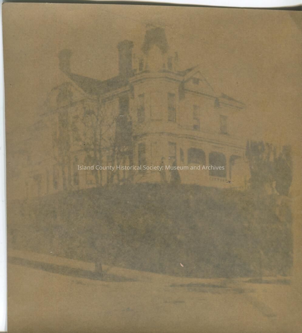 Black & white photo of a large 3-story Victorian-style house. The description on the back says, " D.B. Ward's home - Seattle".