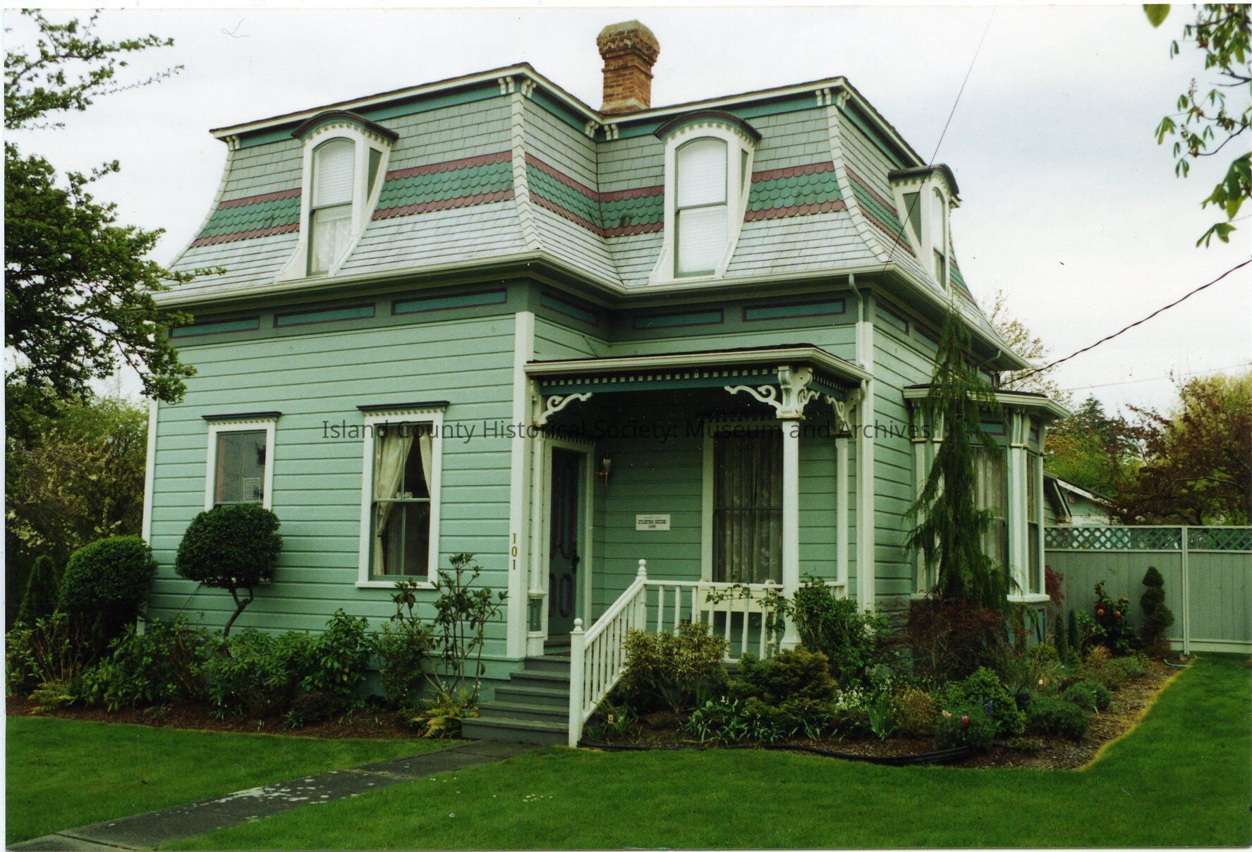 Photo of a house with a central chimney, bay window facing the street, side windows, 3 windows on the mansard-style roof, on the left is the narrow front porch. A fence is at the edge of the house on the right enclosing the one-story wing in the back. This house is located at 101 NE 7th St. Coupeville. When this was taken the house was very green with a stripe on the roof.