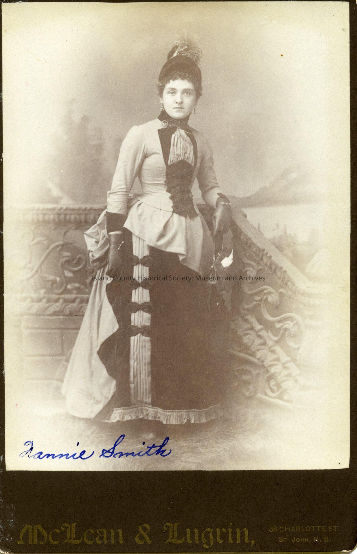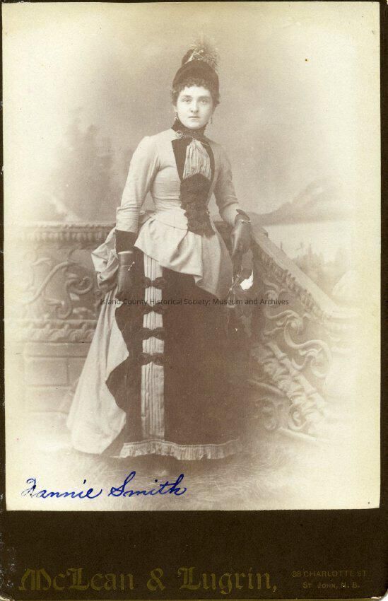 Portrait of Fannie Smith wearing an ornate dress, gloves, and a hat.
