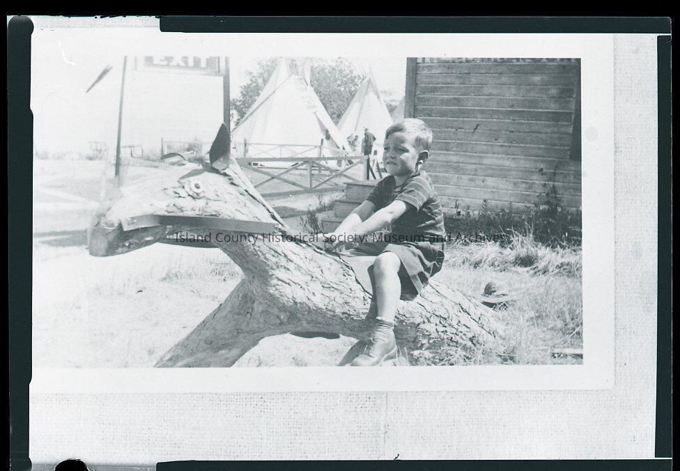 Negative of a boy "riding" a stump or log made to look like a horse; it has reins. In the background are two teepees and an EXIT sign. The boy is wearing a striped shirt, shorts, socks and shoes. Hendrickson is in the wood of the building behind him. On the back of the photo: Jim Zylstra, son of Earl & Helen Zylstra, grandson of James Zylstra, attorney.