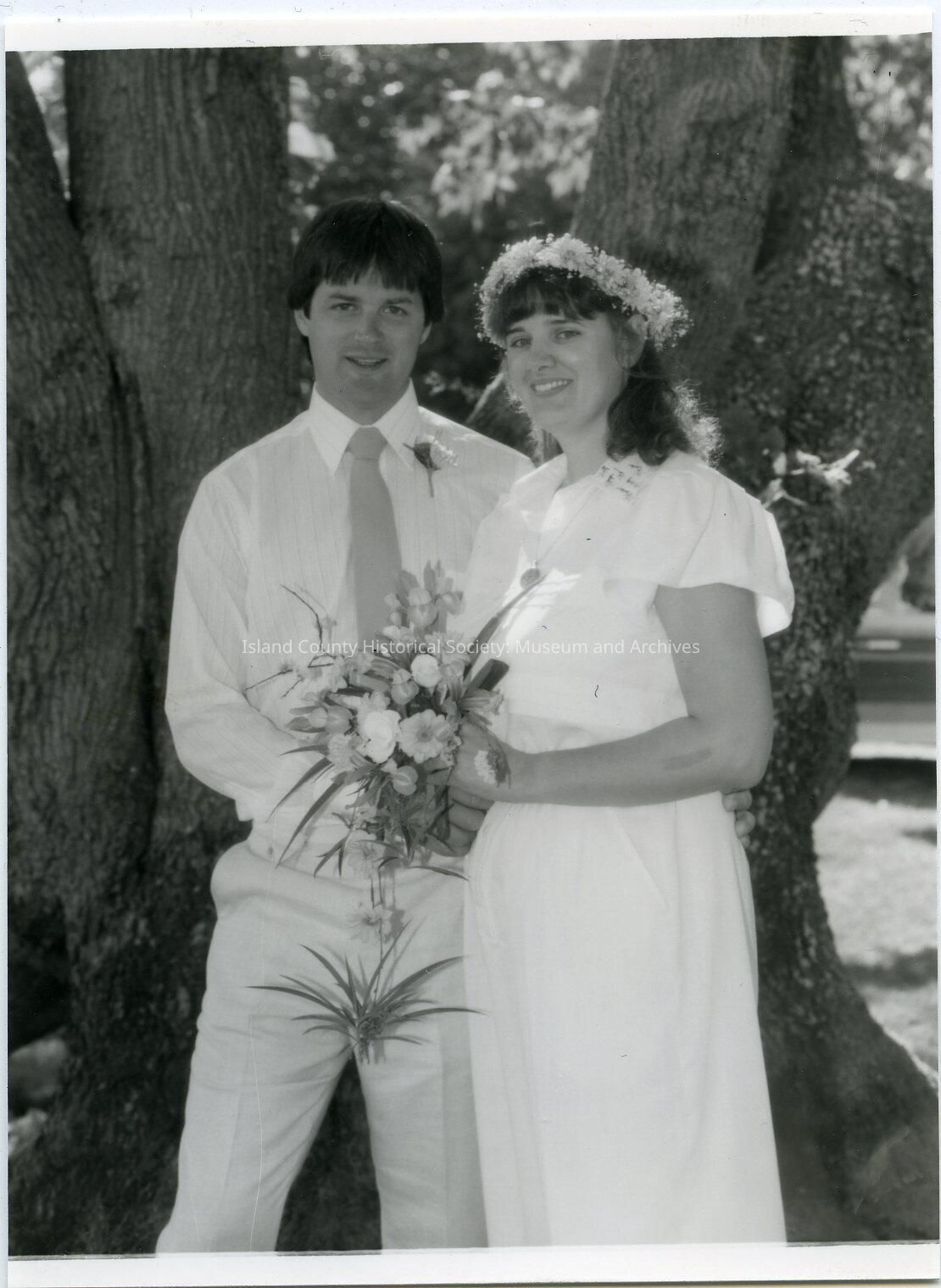 Photo of a young couple under some trees, after they were married. She is wearing a short-sleeved dress with a wreath of flowers in her hair and a bouquet. He is wearing a shirt, tie and trousers with a flower on his left shoulder. On the back: Zy/stra-Cummngs.