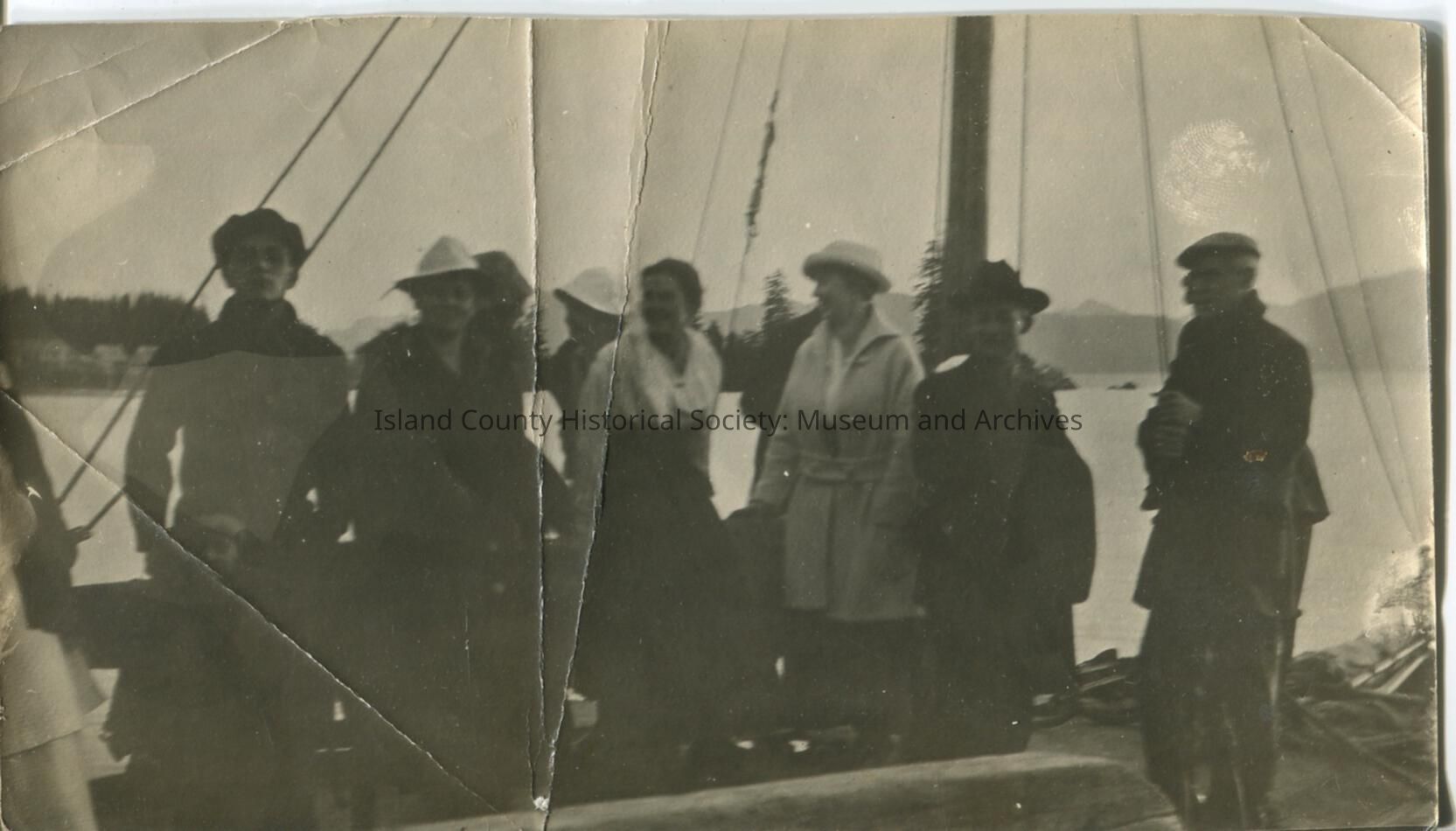 Black & white photo of a group of men and women on a sailboat. No description or date.