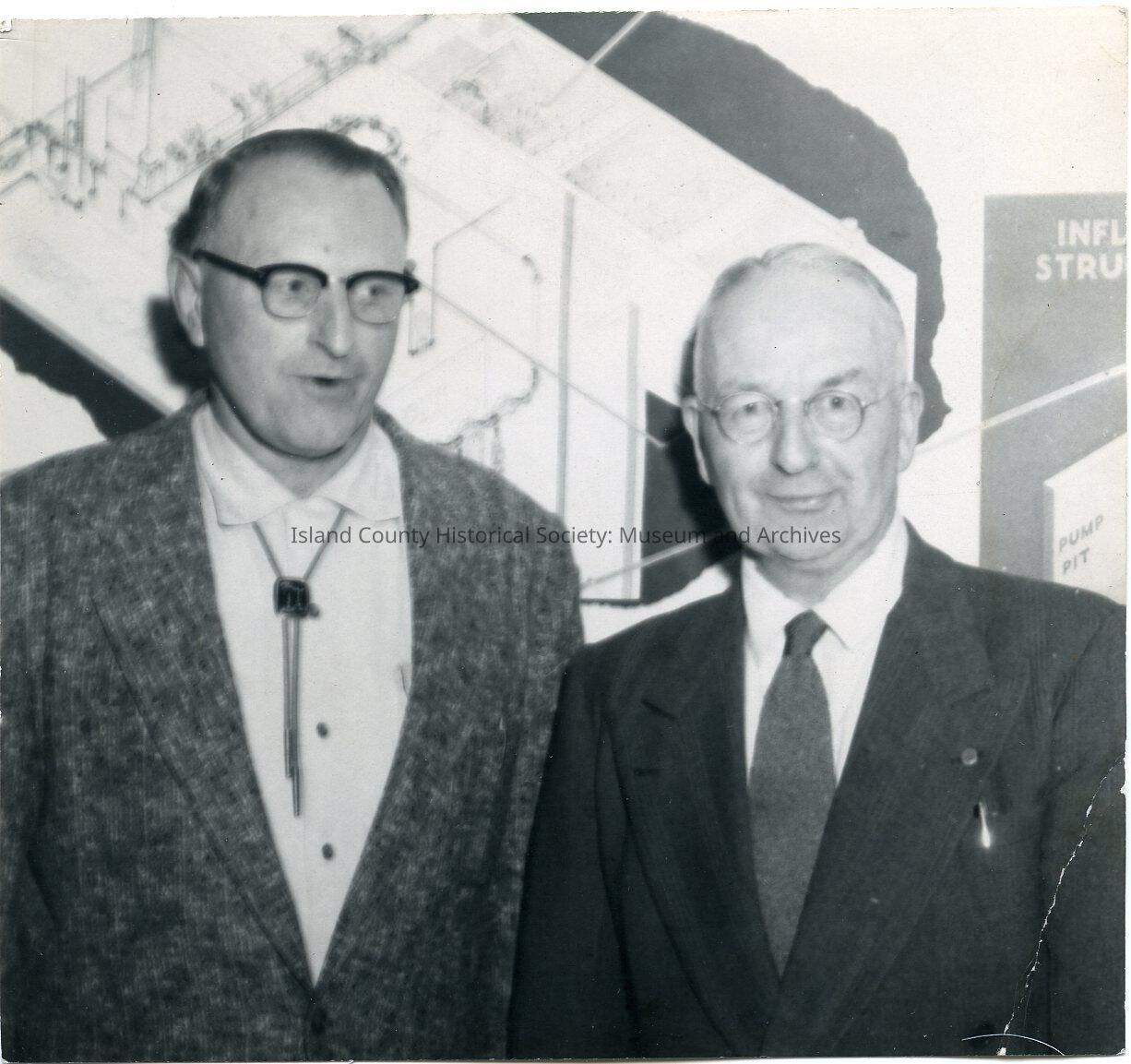 Photo of two men in an office witih posters behind them. They are facing the camera. Both are wearing suits and glasses. The one on the left is wearing a bolo tie. On the back: Reke Zylstra and Ray Maylor, Mayors OH (Oak Harbor)