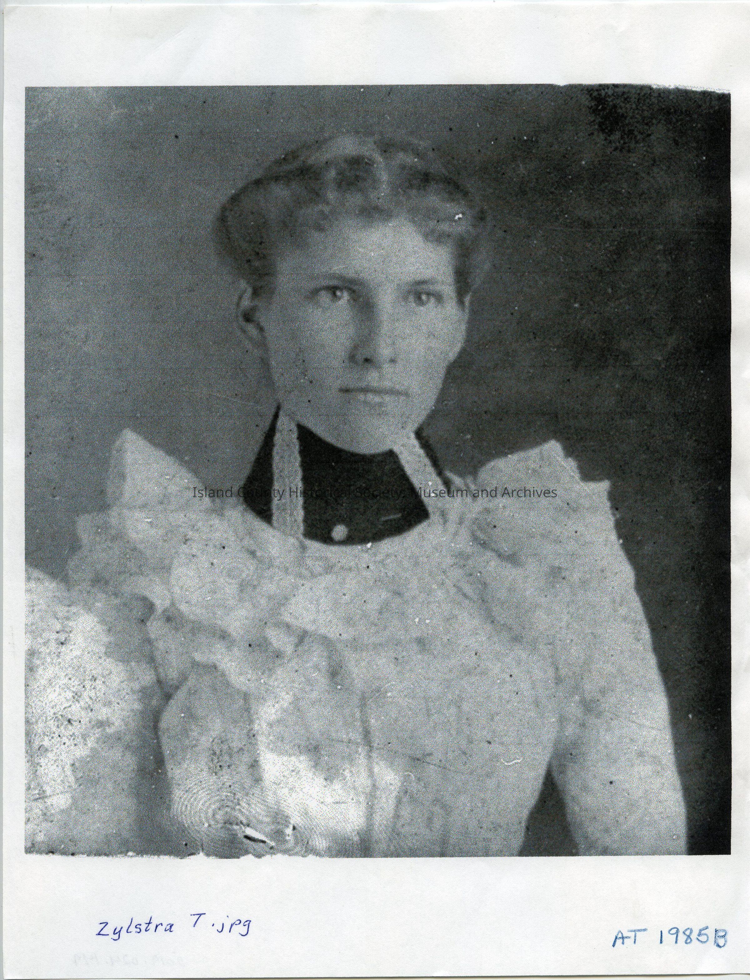 Photocopy of a young woman wearing a dress with ruffled pinafore or apron or overdress which has a lace ribbon around her neck. This is a photocopy of 2019.024.148. On the front: Zylstra T.jpg - but no information on where this copy is digitally stored.