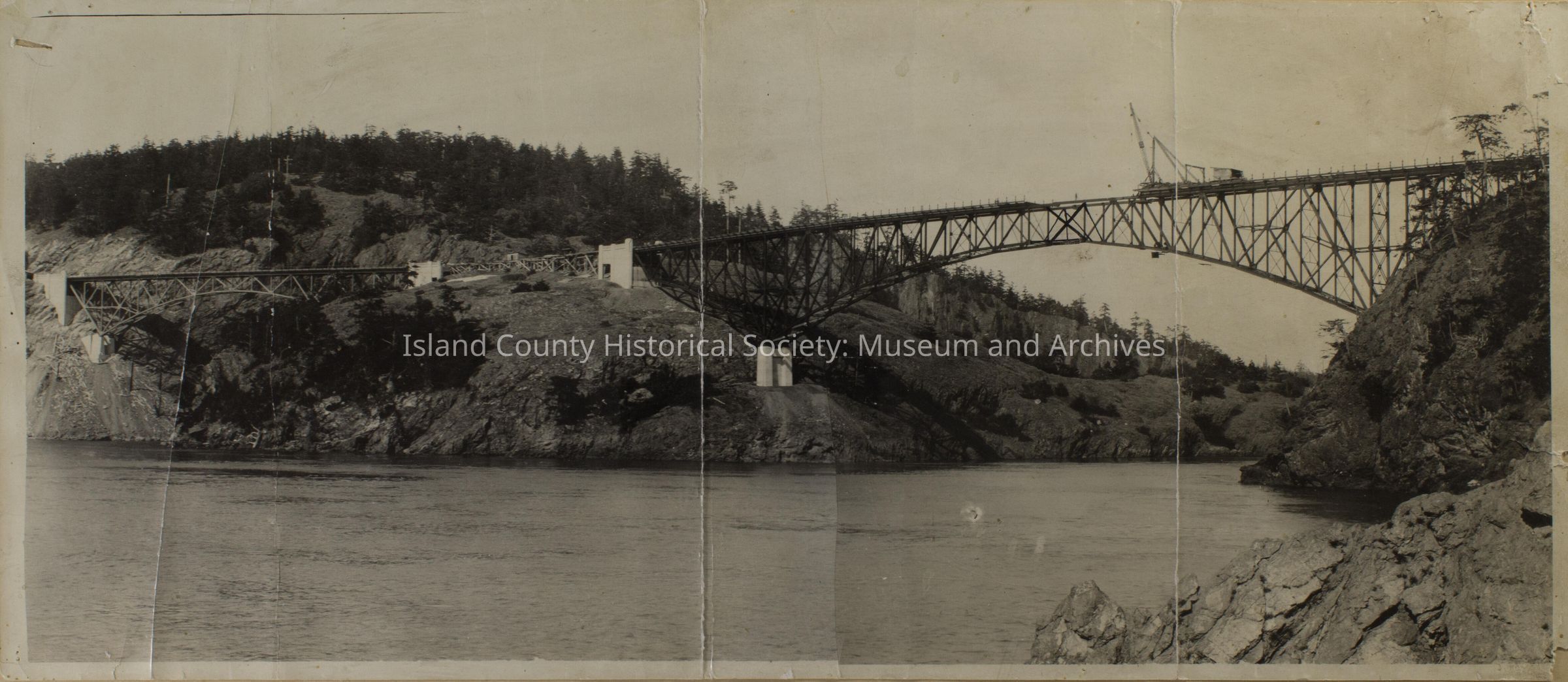 Panorama of Deception Pass Bridges under construction but failry close to being finished. A crane is on Deception Pass Bridge. The photo was taken from the west side Deception Pass looking towards Fidalgo Island.