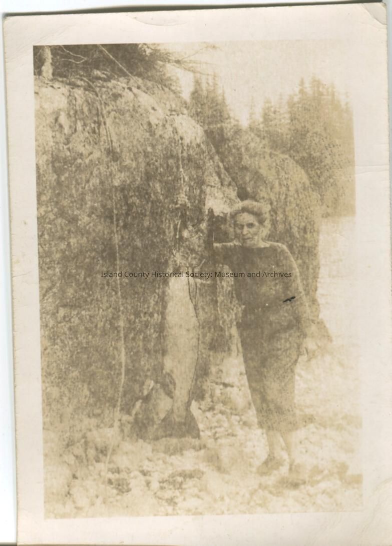 Black & white photo of a woman holding a large fish. She is standing on a rocky shore by a large boulder. No description or date.