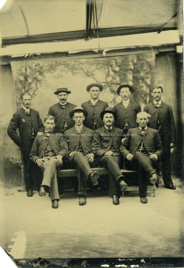 Group of photo of nine men all wearing suits, most wearing hats.