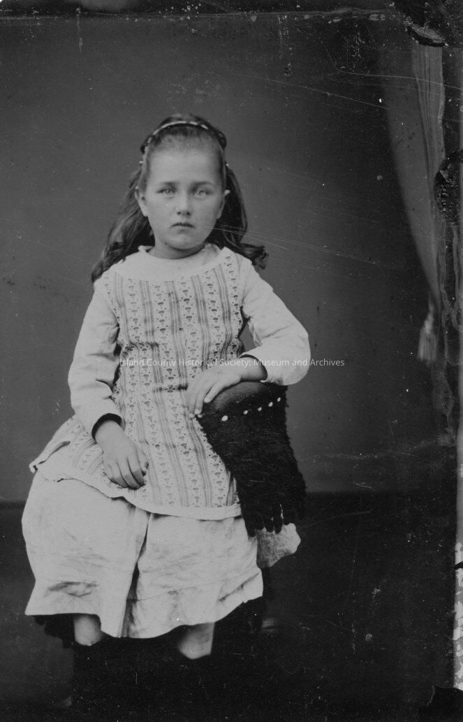 Portrait of Libbie (Calhoun) Herrett, seated in a child's sized chair wearing a white dress.