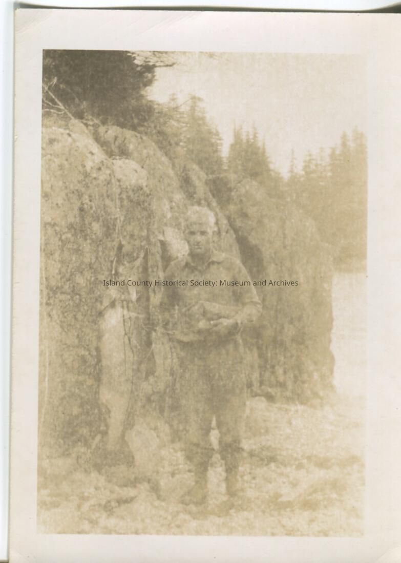 Black & white photo of a man holding a large fish. He is standing on a rocky shore by a large boulder. No description or date. This photo is similar to 2016.167.112 and appears to be taken at the same place and day.