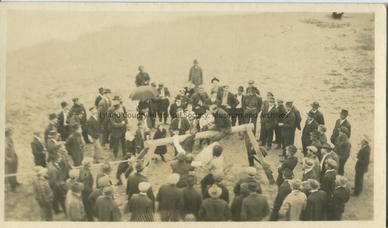 Black & white photo of a large group of men and children standing is a circle around a large saw horse. There is a man sitting on top of the saw horse and one who just fell off. It appears that this may be a lumberjack contest. No description or date. However, based on the postcard stamp, AZO with triangles in the corners, the photo was taken between 1904-1918.
