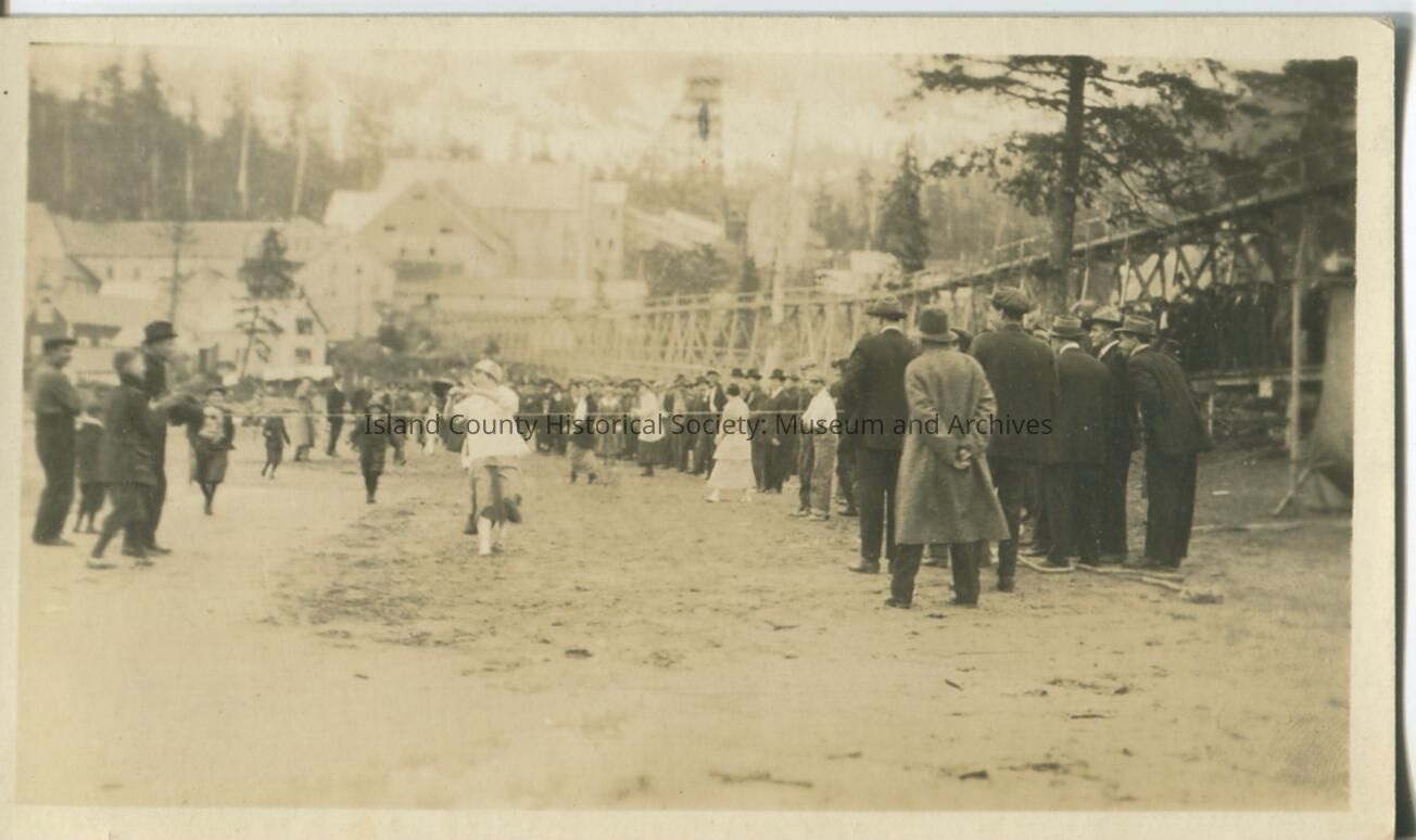 Black & white photo of a large group of men, women and children observing a running race. The town in the background looks like a lumber town. No description or date. However, based on the postcard stamp, AZO with triangles in the corners, the photo was taken between 1904-1918.