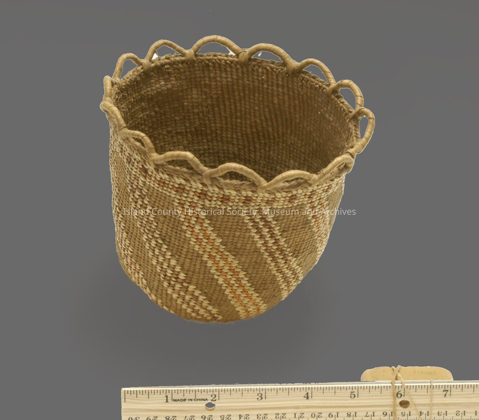 medium, high basket, brown scalloped top edge, diagonal stripe of orange, ecru, red; Fraser River, Canada