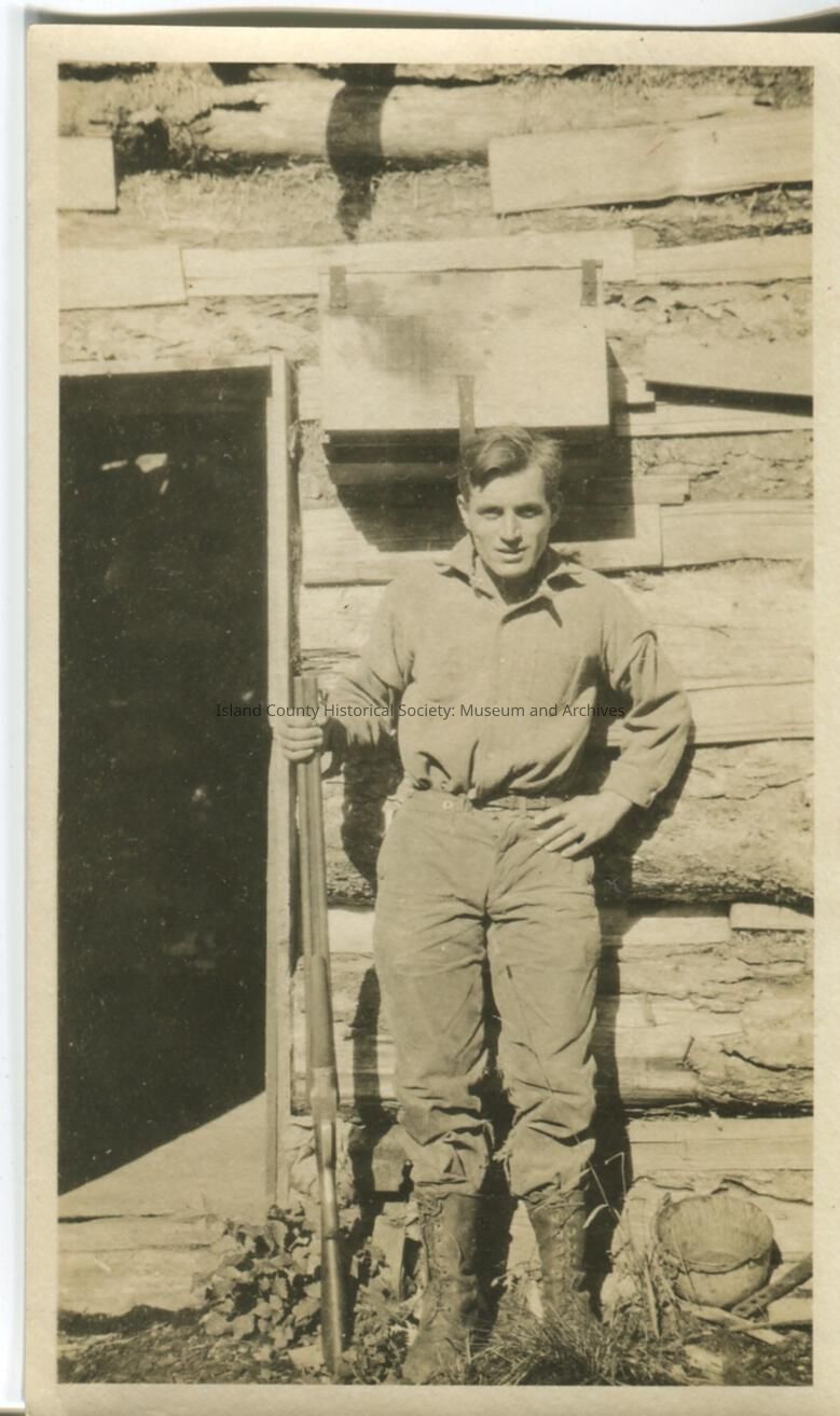 Black & white photo of a man in work pants, shirt, and high laced boots standing in front of a log cabin. The man is holding a shotgun. Handwritten on the back is "Frank Dickey". No date.
