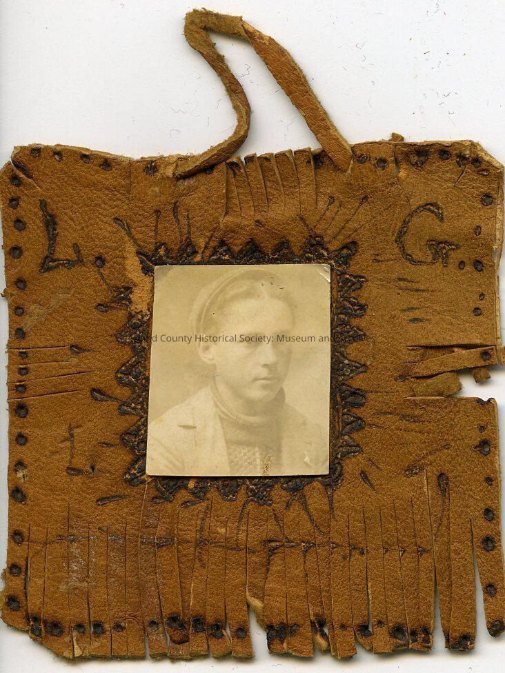 Black & white portrait photo of Laurin Gillespie as a young man mounted on a square piece of leather. The leather has burned-in decorations, fringed edges, and a loop on the top. The photo glued on the leather is approximately 1" square and is quite faded. Laurin is wearing a cap, jacket, and sweater. No date.