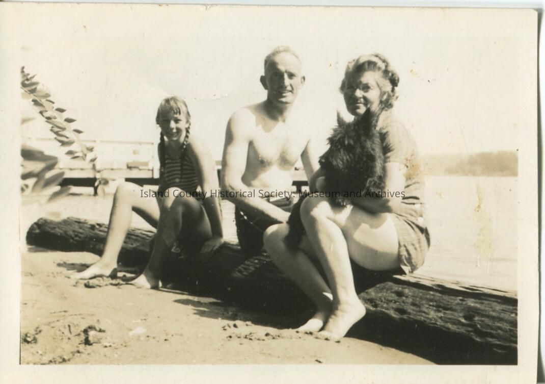 Black & white photo of a child, man, and a woman holding a black dog. The girl and man are in swimsuits and the woman is in shorts and top. All three are sitting on log on a beach. No description or date.