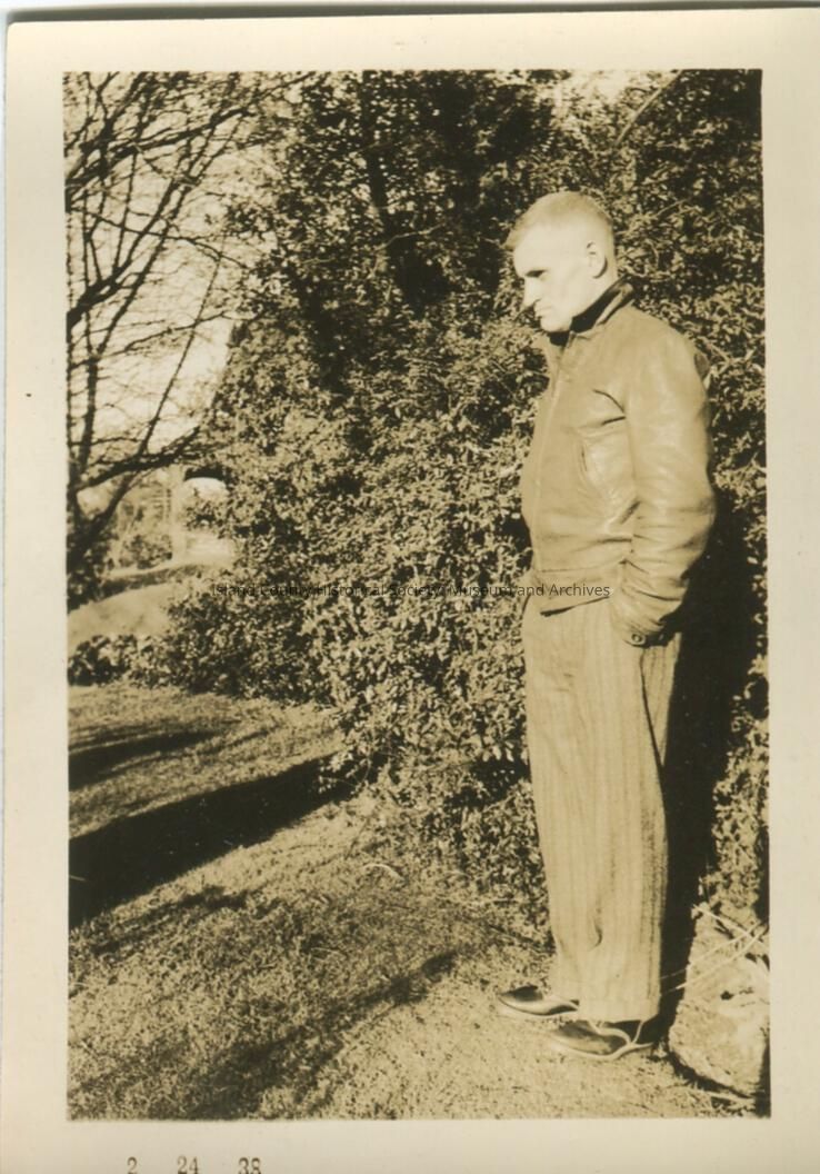 Black & white side photo of a man standing in front of hedges. He has a crew cut and is wearing striped pants and a bomber jacket. No description or date.