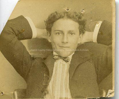 Black & white photo of Laurin Gillespie as a young man. Laurin is sitting & posing with his arms behind his head. He is wearing a dark jacket, striped shirt & bow tie. The upper, left corner of the photo is torn off. No date.