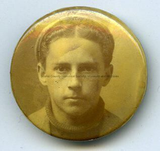 Black & white portrait photo of Laurin Gillespie as a young man mounted on a round metal button/pin. Laurin is wearing a cap, jacket, and sweater. The photo appears to be taken at the same time as 2019.008.101. No date.