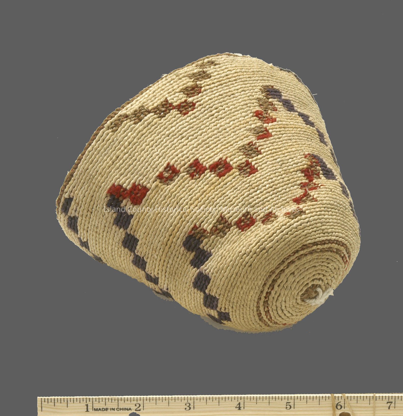 woven grass child's cap; ecru with red yarn and black grass design, zigzag squares; Fraser River, CanadaCollection