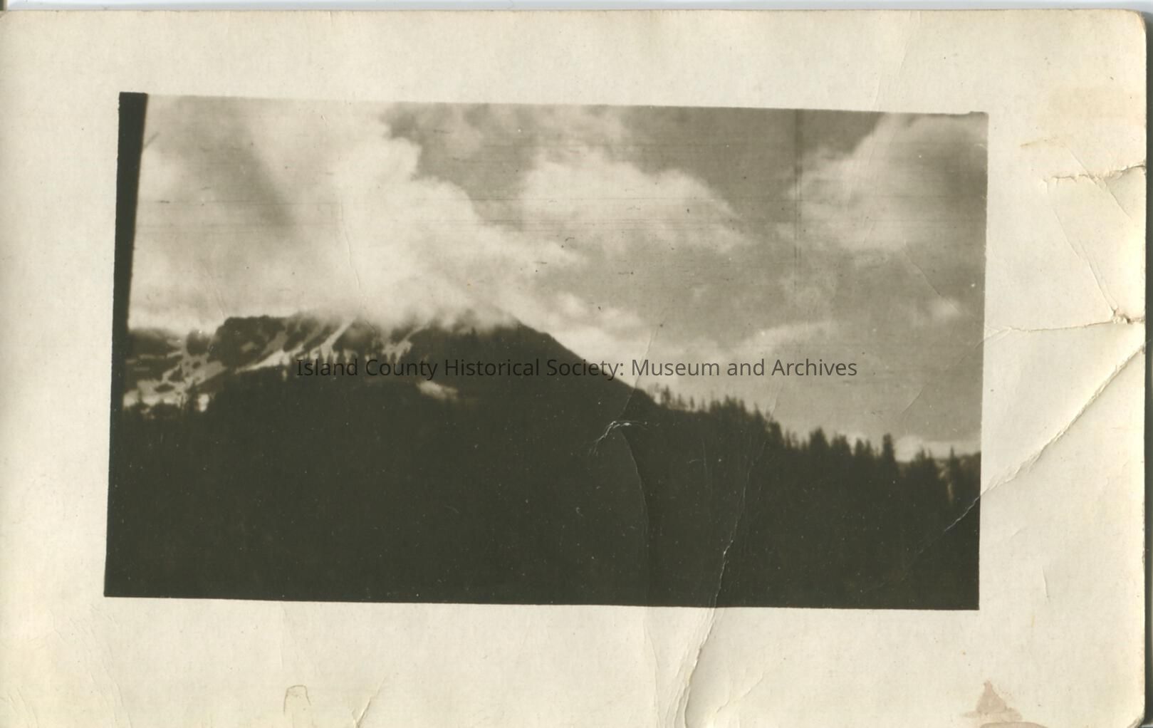 Black & white post card photo of a mountain with clouds over it. No description or date. However, based on the postcard stampbox the date is between 1904-1920's.