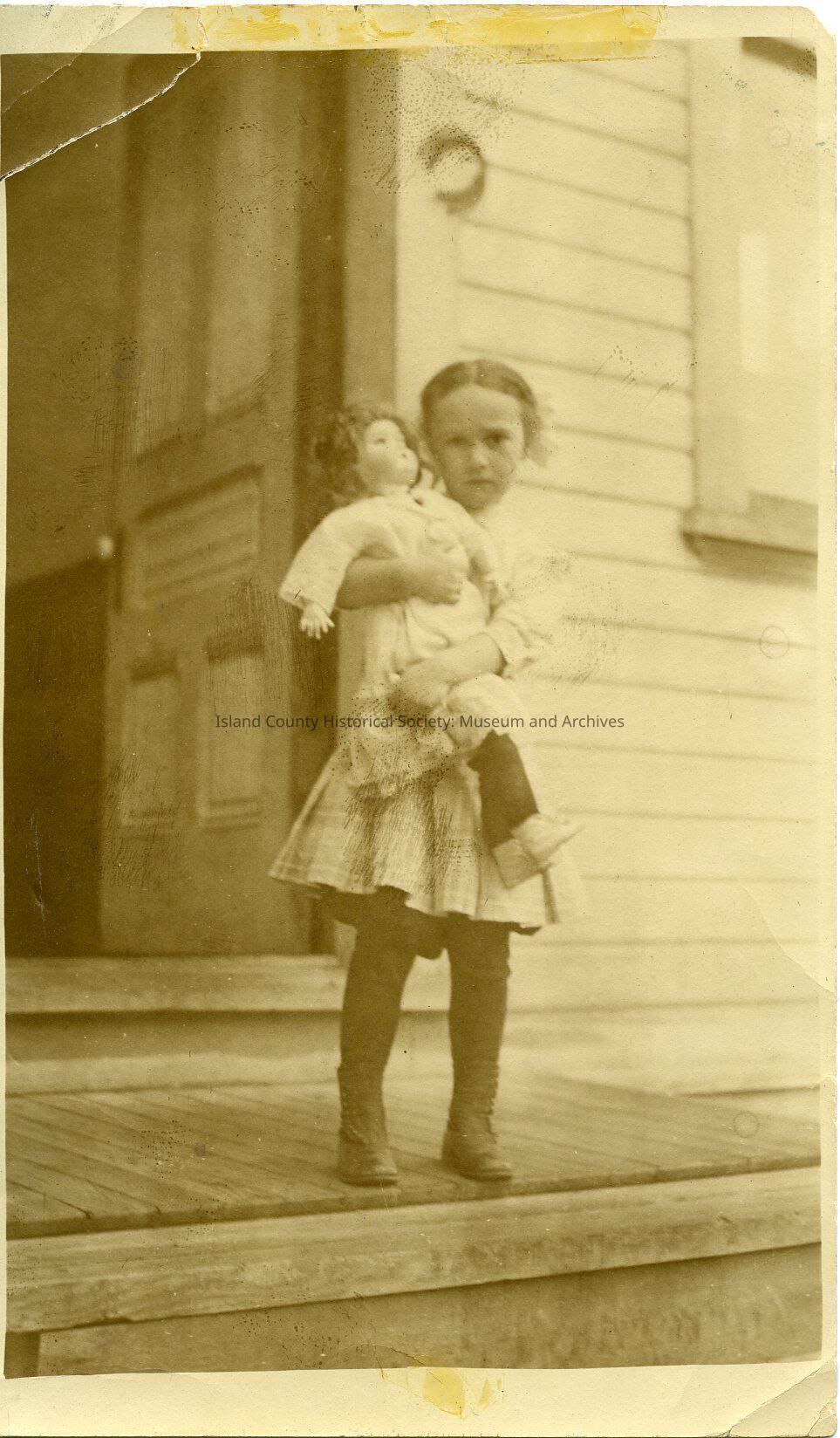 Black & white photo of Ellen Gillespie as a young girl. She is standing on a house porch holding a large doll. Her hair is parted in the middle and tied back. She is wearing a dress, stockings and boots. Circa 1910.