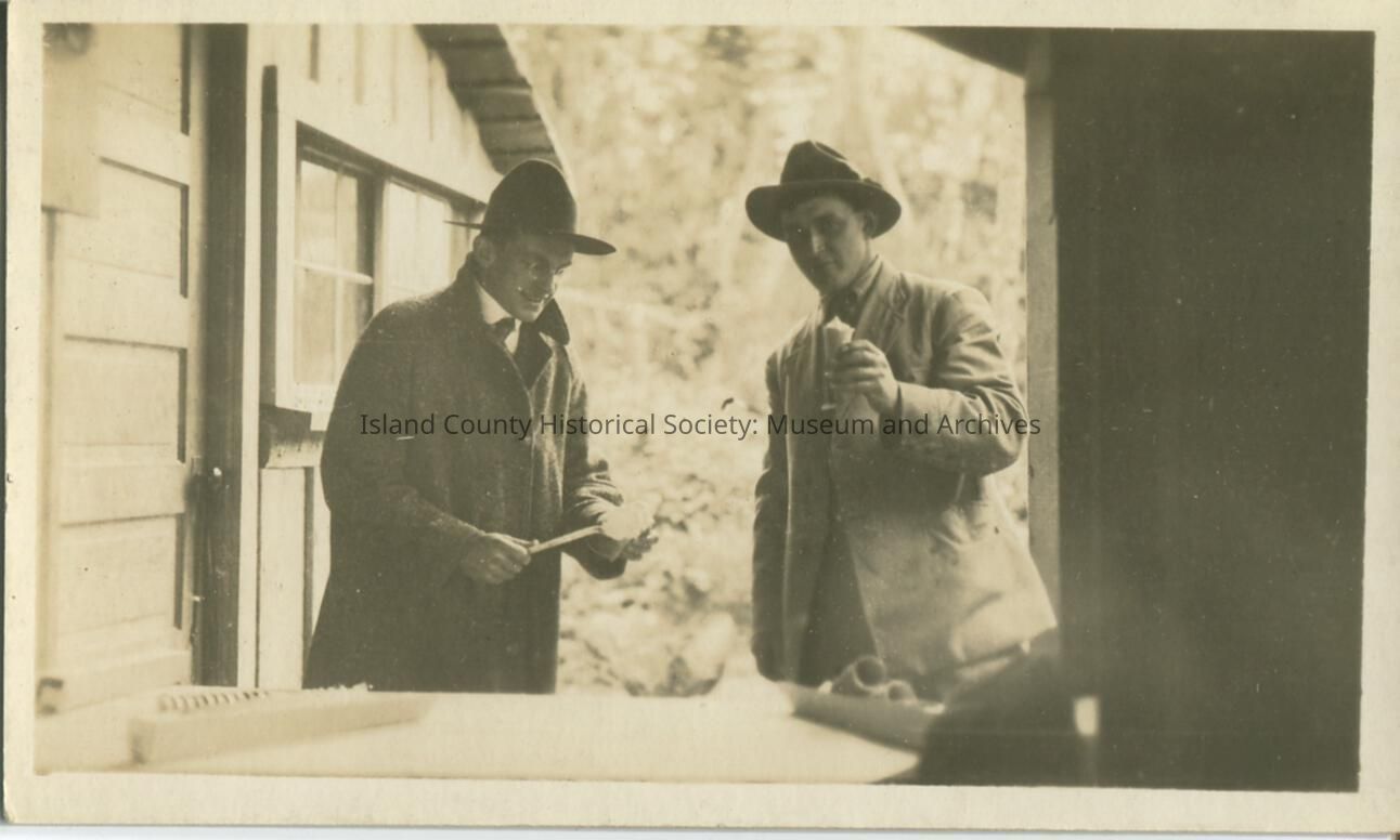 Black & white post card photo of two men talking on a porch. Both men are wearing heavy jackets and brimmed hats and are standng. No description or date. However, based on the postcard stampbox, the date is between 1904-1918.