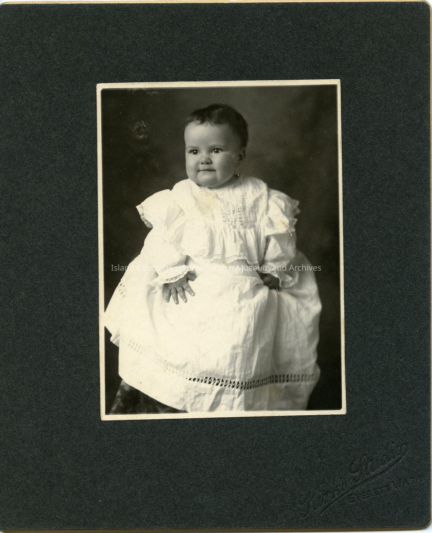 Black & white portrait photo of Thelma Gillespie as a baby. She has short dark hair. She is wearing a long, white dress with lace on the bodice & sleeves. She is sitting on a chair/stool with her hands resting on the sides of her dress. No date. The photo is mounted on a gray cardboard backing. Kirk's Studio, Everett, WA is embossed in the lower right corner.
