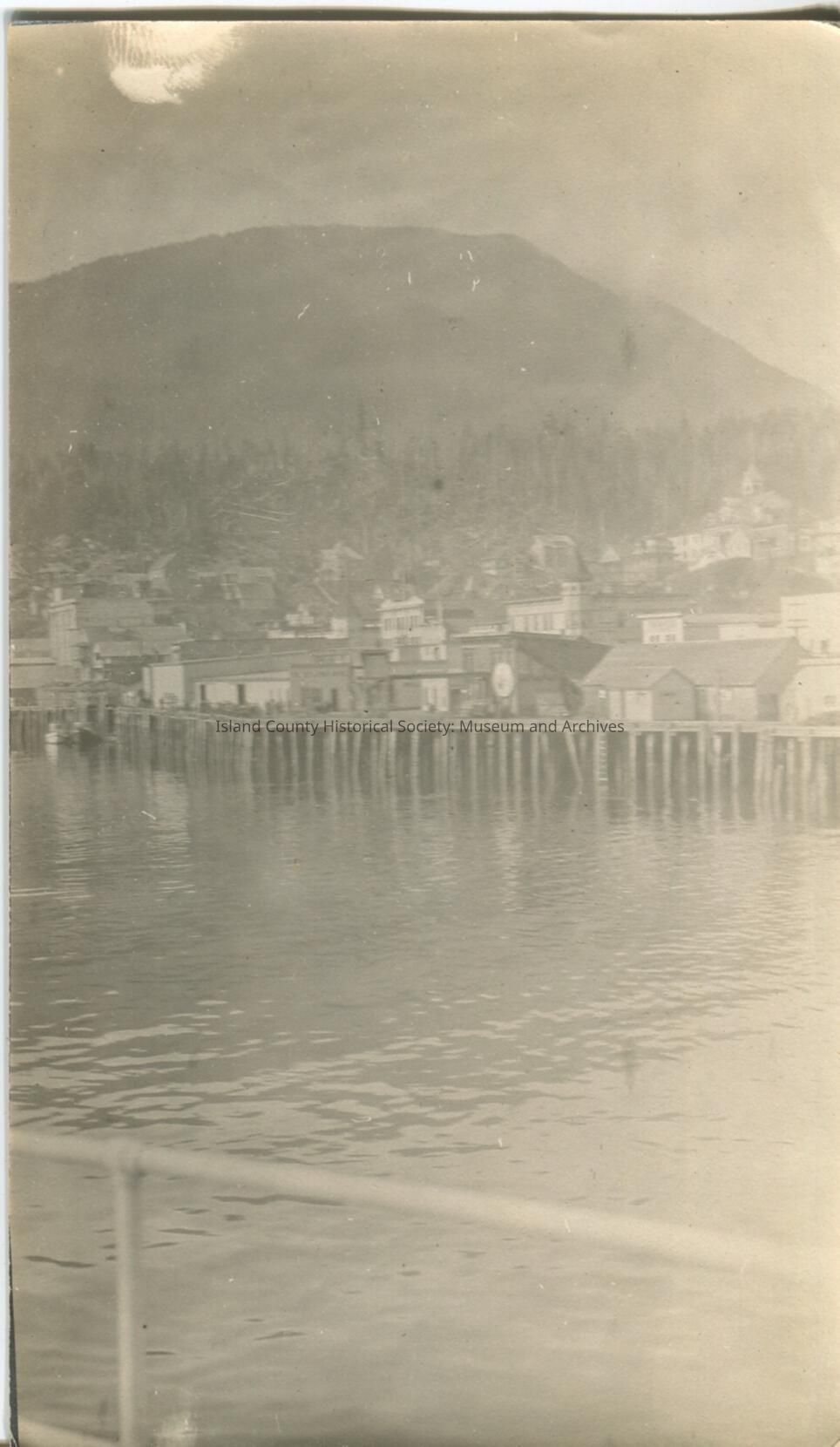 Black & white photo of a frontier town on a waterway with a mountain in the background. The photo was taken from a boat - the boat railing is in the foreground. No date. Hand written on the back, "Latouche, Alaska".