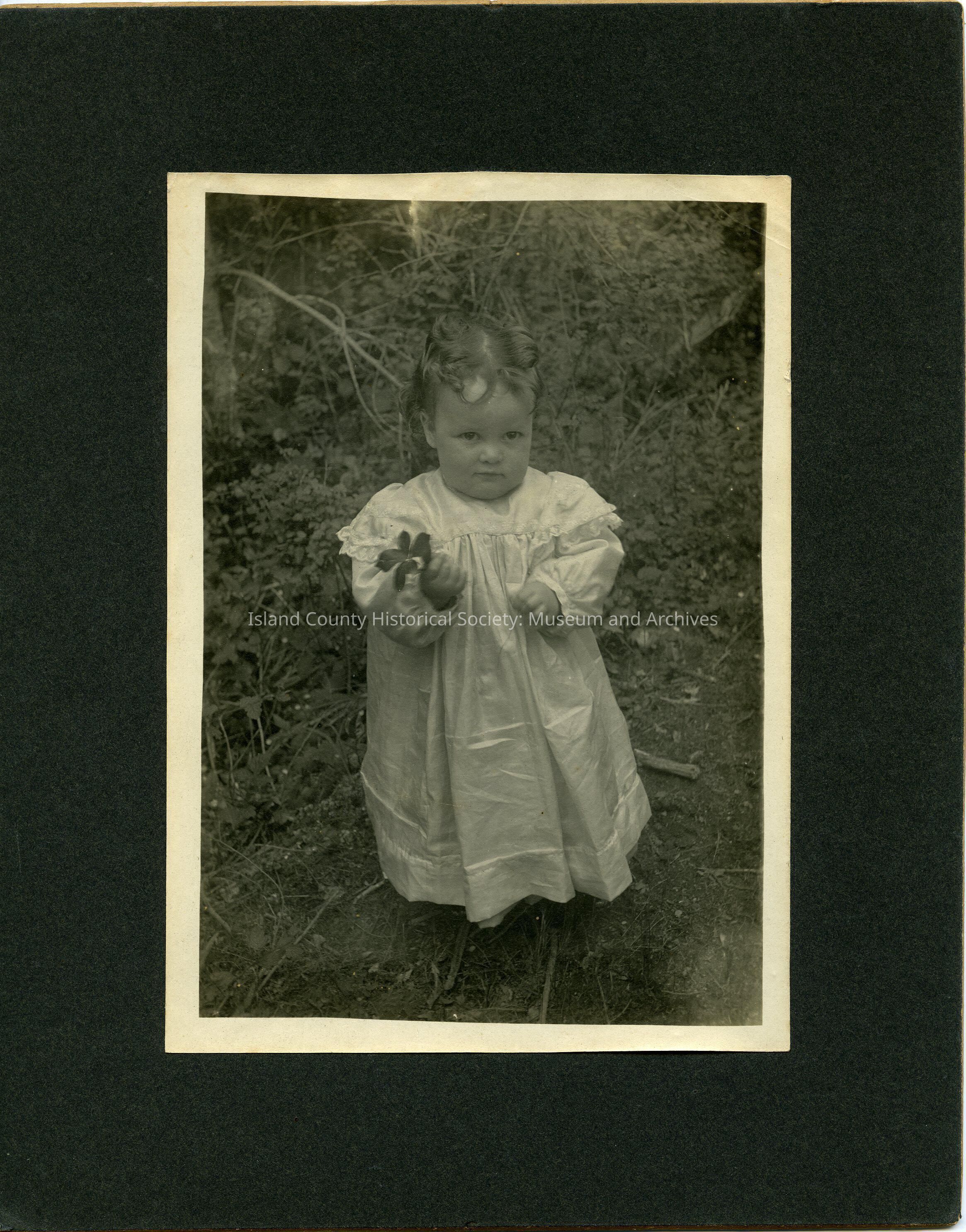 Black & white photo of Thelma Gillespie as a toddler - 18 months. She has medium brown hair pulled back. She is wearing a long white dress with long sleeves. She is standing in a garden holding a flower in her right hand. No date. The photo is mounted on a gray cardboard backing.