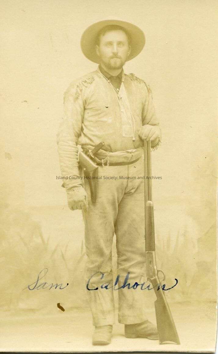 Portrait of Sam Calhoun with a shotgun in one hand and a knife tucked in his belt.