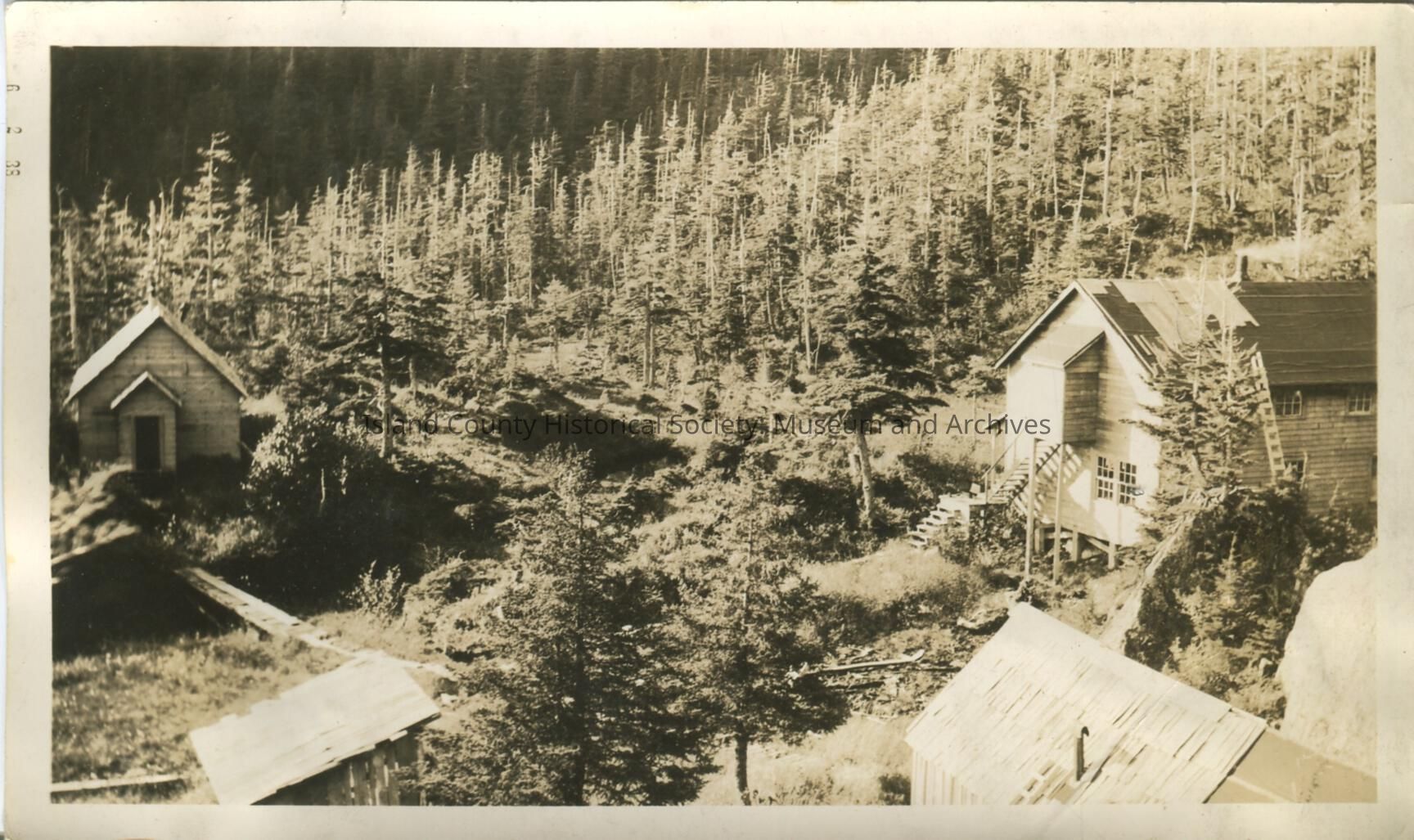 Black & white photo of wood buildings in a frontier town. Printed on the side of the photo is 6/2/39. Hand written on the back, "Latouche, Alaska".