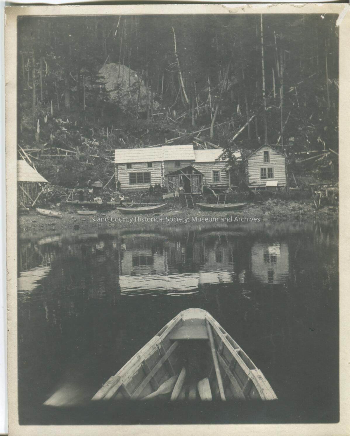 Black & white photo of a large log house in a wooded area. There are several canoes on the shore in front of the house. The photo is taken from a canoe or boat - the bow is in the foreground of the picture. No description or date.