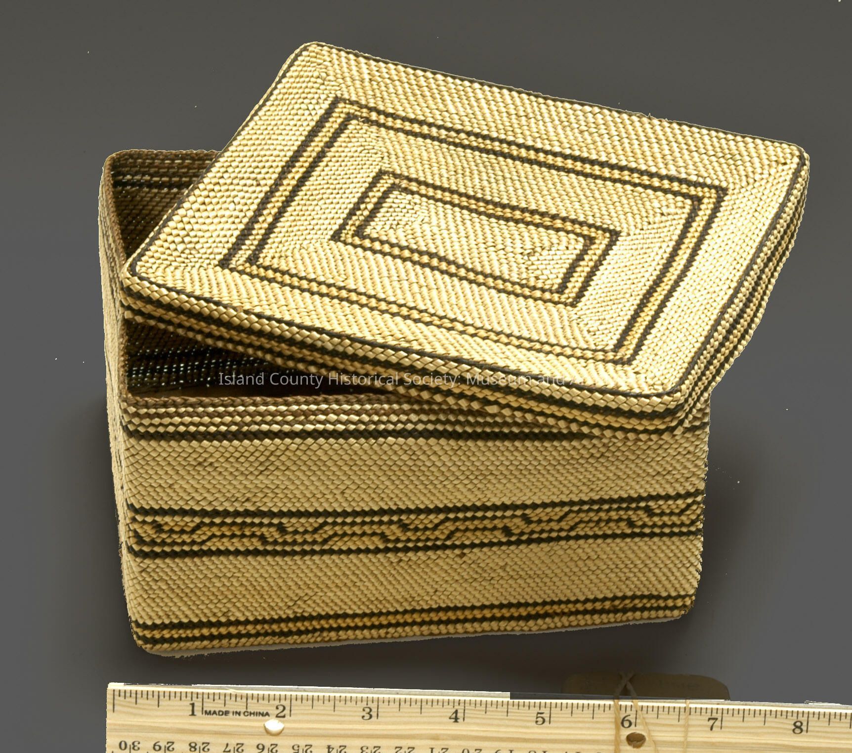rectangular basket, intricate stripes, and lid; Neah Bay areaCollection