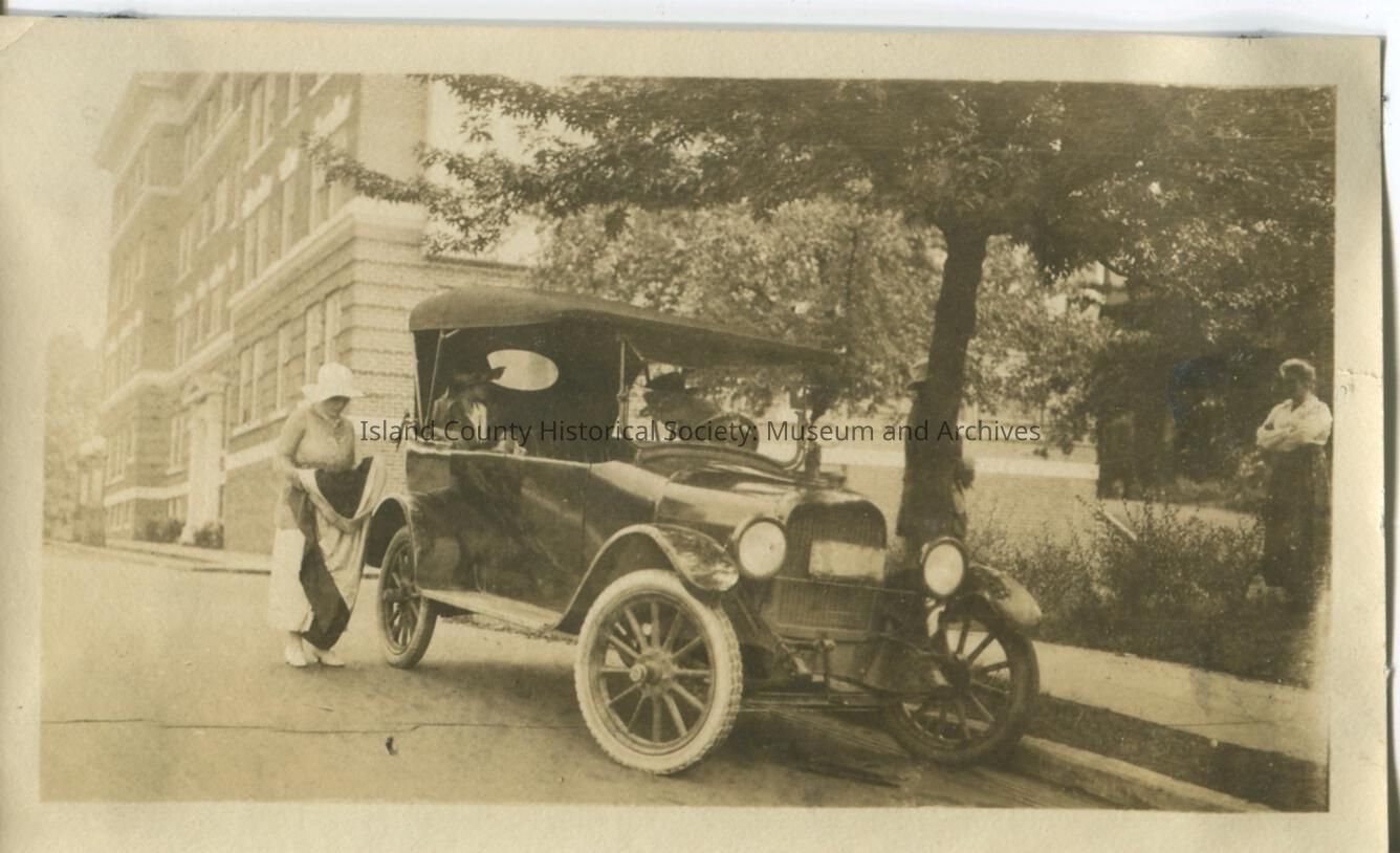 Black & white photo of an old car (maybe a Model T?) parked on a street in a city. There is a woman in a long dress standng near the rear of the car, another woman in the back seat, and a man leaning into the car. No description or date.