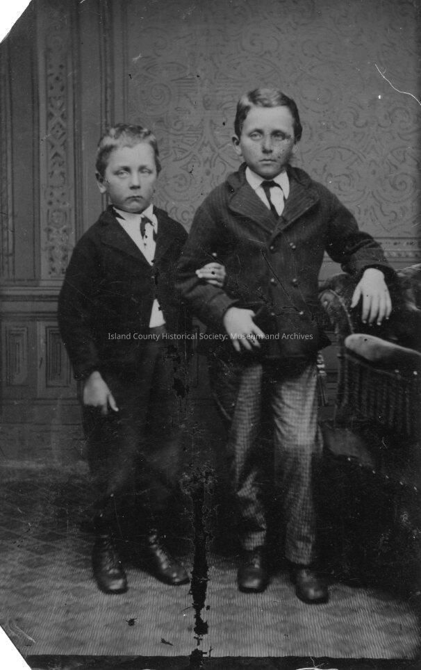 Portrait of Elmer and Spurgeon Calhoun both wearing suits, standing together.