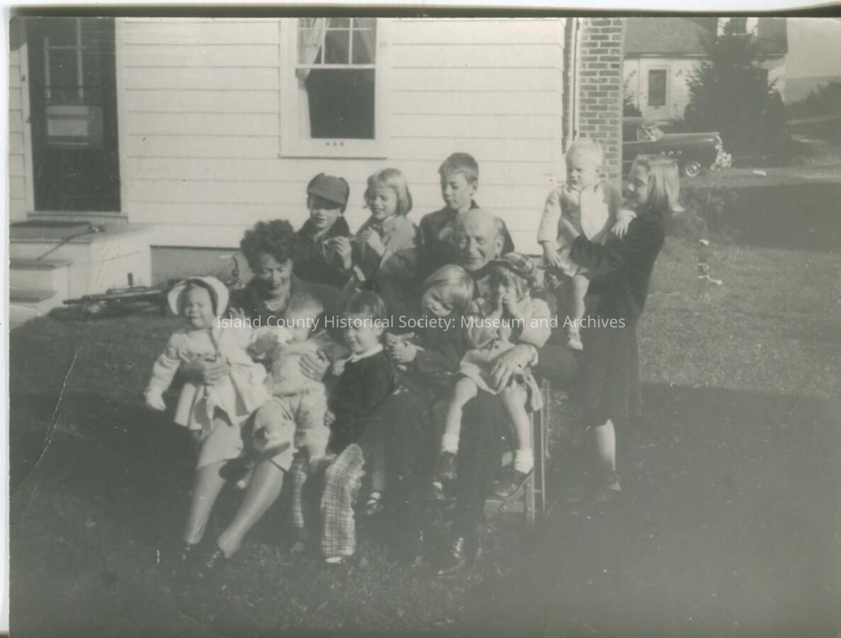 Black & white group photo of an elderly man & woman surrounded by 10 children. They are sitting in a yard in front of a house. There is an old car, maybe 1950s, visible in the background.