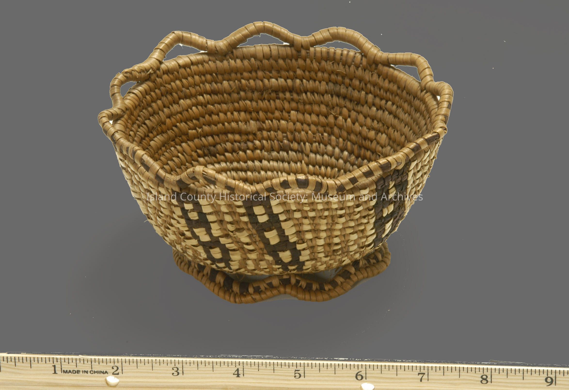 small, scalloped top edge basket; mixture of brown and ecru, vertical dark brown stripes, raised base; Fraser River, Canada