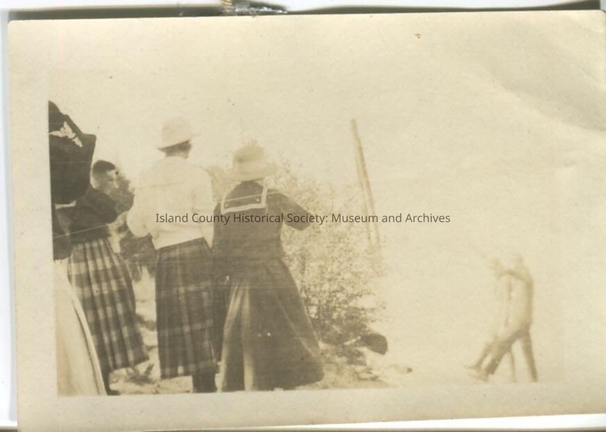 Black & white faded photo of four woman/girls looking at two men that appear to be marching in the background. There is a sailing ship moored in the background. The girls are dressed in mid-calf skirts with jackets. Two girls are wearing hats. The right half of the picture with the marching men and ship is very faded. No description or date.