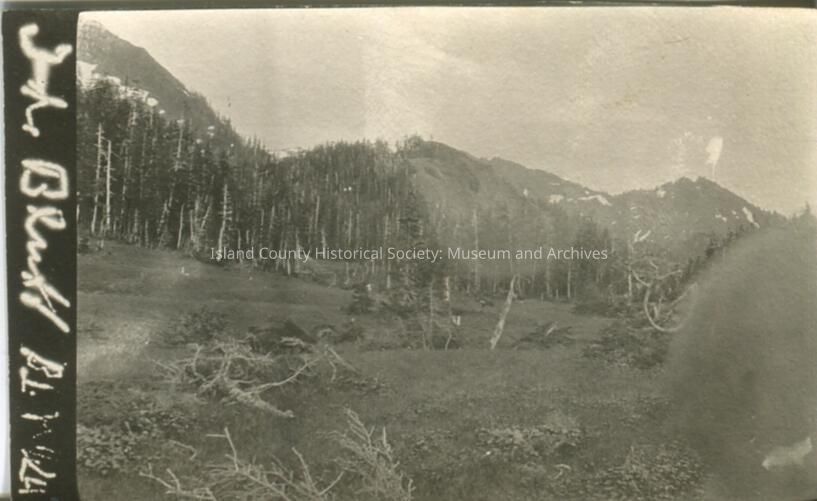 Black & white photo of mountains with a field and forest. On the side of the photo is written "...Bluff..." No date.