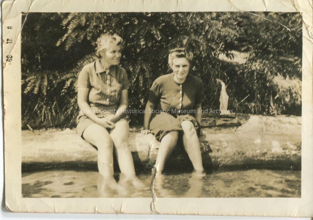 Black & white photo of two women sitting on a log by the water. They are dangling their feet in the water. Handwritten on the back: "Hester & Dorothy". The stamped date on the photo is 9/21/39.