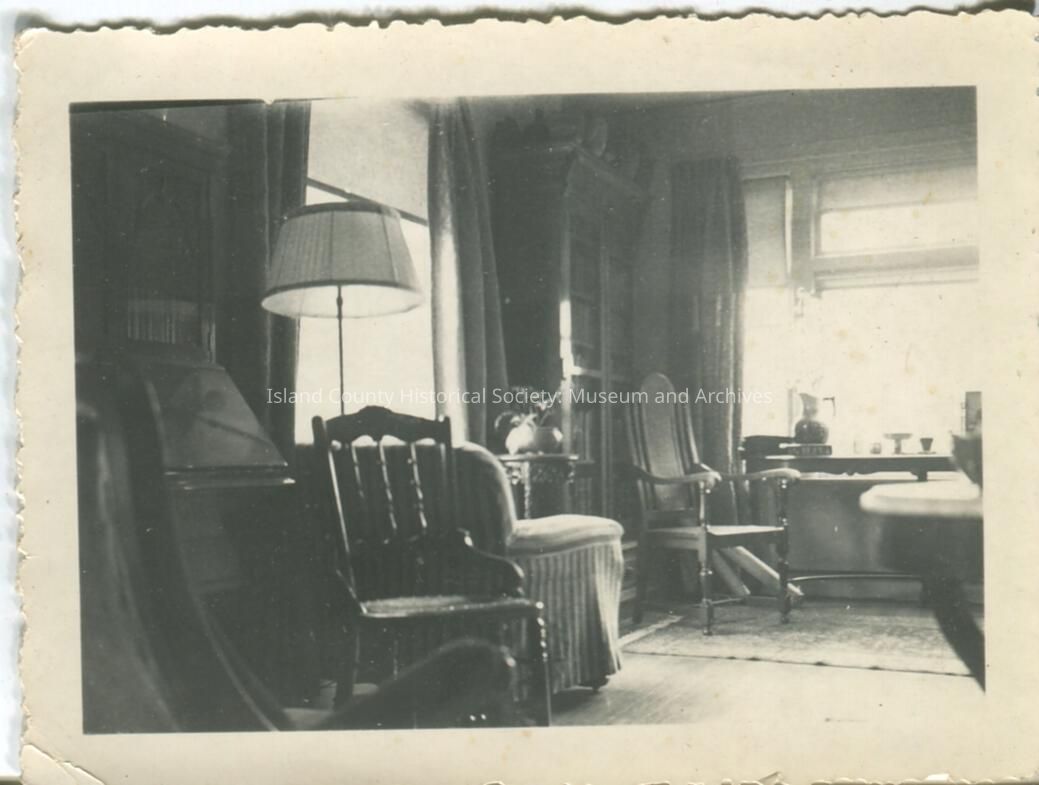 Black & white photo of a living room in a house. There are three chairs, a floor lamp, two large bookcases and large windows visible. No description or date.