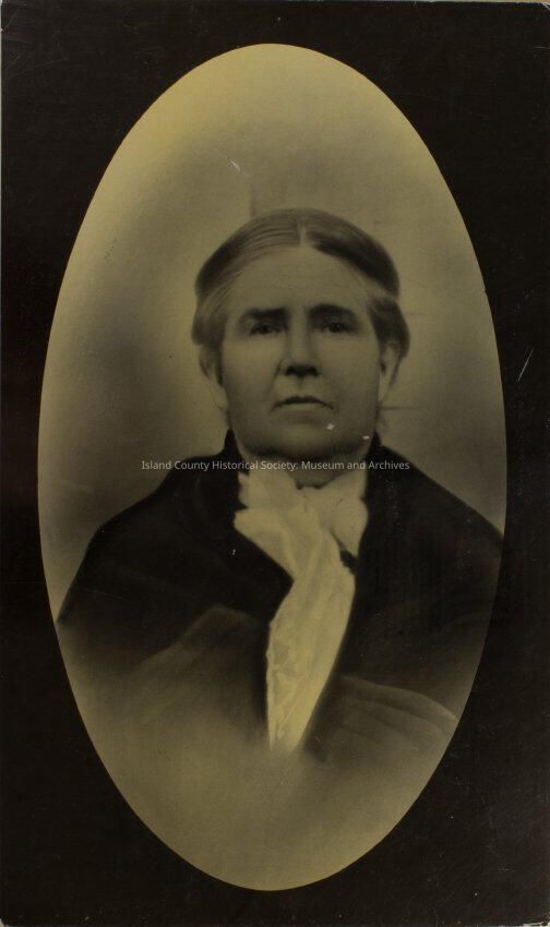 Photo portrait in an oval setting of an older woman. She is wearing a jacket with a small collar, a lacy tie. Her hair is parted in the middle and pulled back. On the back: From the Izette Collection.Made/Created